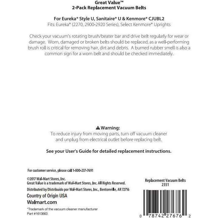 When it’s time to replace your vacuum’s drive belt, look no further than Great Value Replacement Vacuum Belts. The drive belt is a critical component of your vacuum that allows the brush roll to spin and help remove dirt and debris from your floors. To maintain optimum performance of your vacuum, you should check your vacuum’s rotating brush/beater bar and drive belt regularly for wear or damage and replace when needed. Each package contains two replacement belts. Check your vacuum’s user guide for detailed replacement instructions. When your vacuum’s drive belt is worn and is in need of changing, use Great Value Replacement Vacuum Belts.Great Value products provide families with affordable, high-quality grocery and household consumable options.